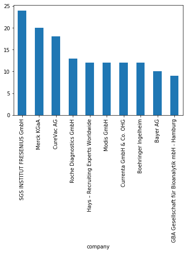 Für die gesammelten Jobs scheinen bei StepStone und Indeed viele Personalagenturen aktiv gewesen zu sein, von Hays über Professional Scientists, Tempo-Team, JOB Kontor… Daher ist in dem Fall die Zuordnung zu einer konkreten Firma schwierig. Bei Indeed sind es tendenziell mehr Dienstleister, die etwas veröffentlichen, zumindest bei dieser Top10-Ansicht.