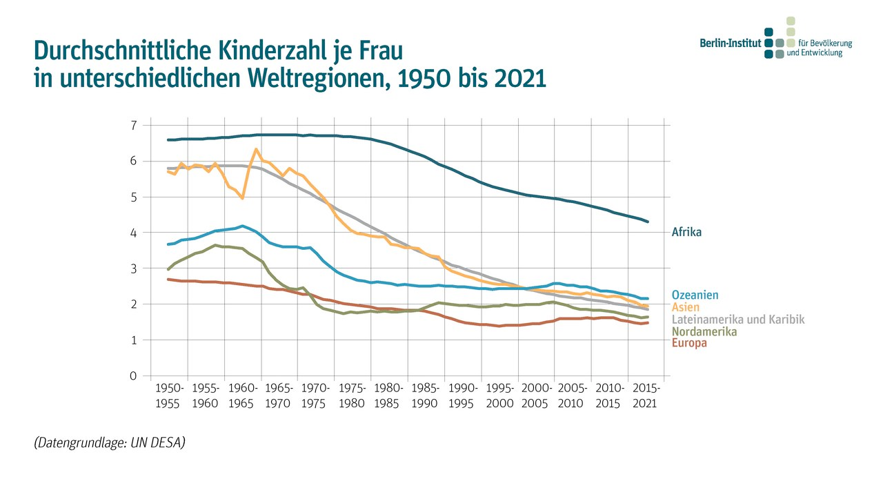Auf den ersten Blick bietet sich die Zuwanderung aus Afrika an. Dieser Kontinent ist bei der Entwicklung der Geburtenraten hinter den anderen Kontinenten. Daher leben dort momentan noch recht viele junge Menschen, die viele Kinder kriegen. Das Berlin-Institut hat dazu eine Grafik: