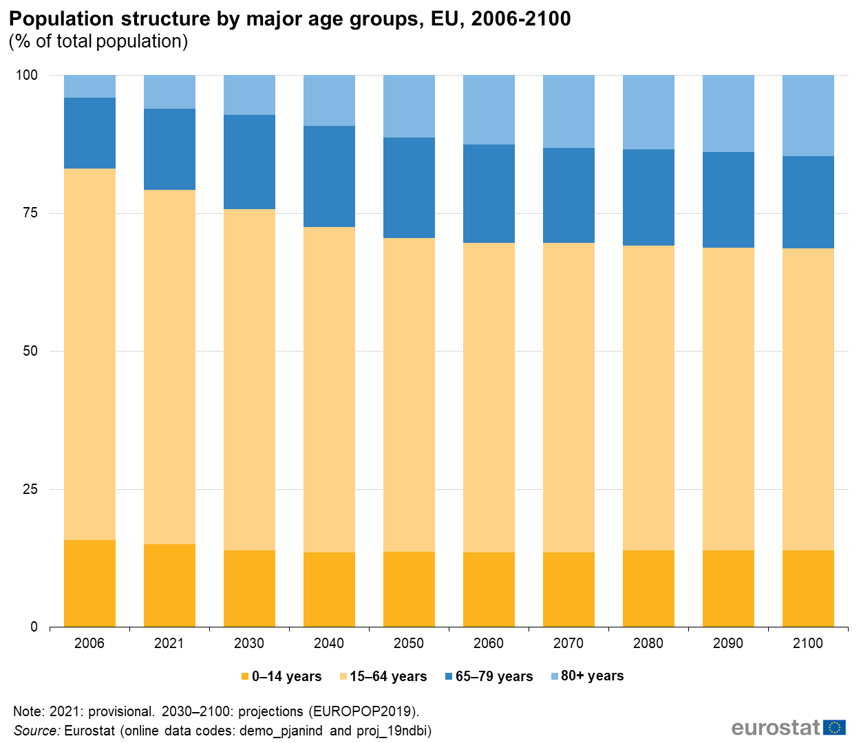 Für Europa sieht es in demographischer Hinsicht nicht gut aus, wenn man extrapoliert. Der Anteil der arbeitsfähigen Bevölkerung sinkt bis 2050 von jetzt ca. 64% auf ca. 58% (aus Grafik geschätzt).