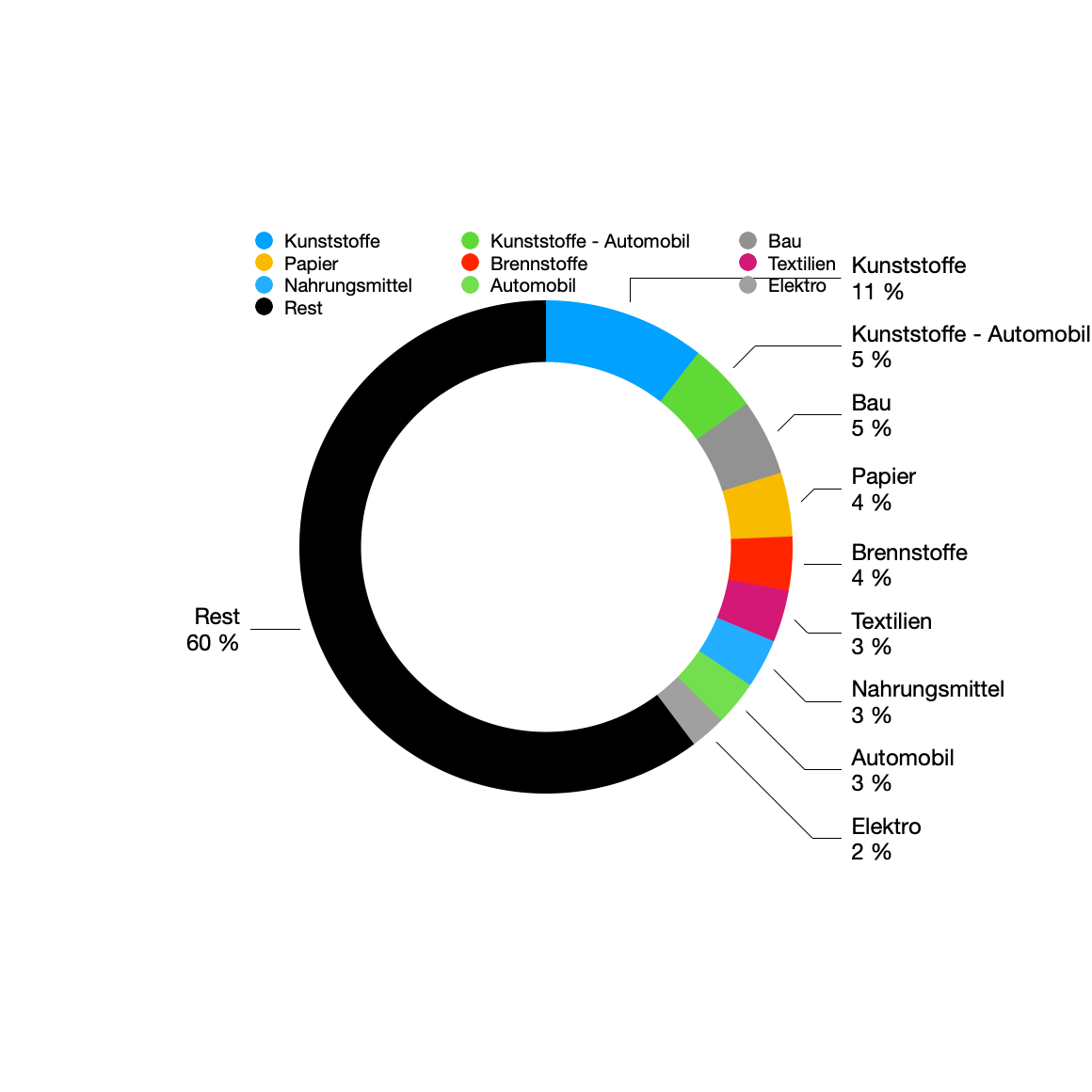 Auf der Webseite der CEFIC habe ich eine Grafik gefunden, die die Kundensektoren der europäischen Chemieindustrie zeigt. Diese zeigt, dass ein Großteil der industriellen Umsätze in Kunststoffe, Bau und Papier (zusammen fast 25 %). Direkt in die Automobilindustrie gehen 3%, in die Computerindustrie 2,4%. Allerdings landen gerade in Deutschland viele Kunststoffe im Automobil, daher verrät uns diese Kundensektoransicht nicht, wie stark die Chemieindustrie von der Automobilindustrie abhängt. Die Kunststoffbranche stellte 2020 ca 30 % technische Kunststoffe her, die auch im Automobilbereich Anwendung finden (Quelle: Böckler).