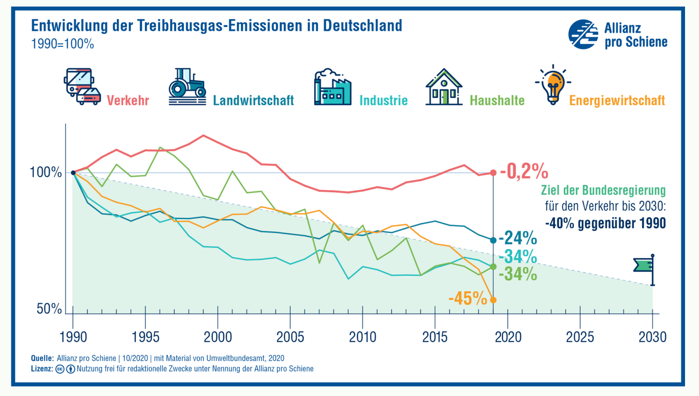 Eine ähnliche Grafik gibt es von der Allianz pro Schiene: Auch hier sieht man, dass der Verkehr den Einsparzielen hinterherhinkt.