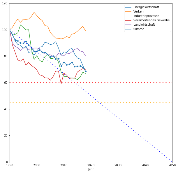 Die Daten, die ich genommen habe, gibt es als Exceldatei beim Umweltbundesamt. Aus der habe ich folgende Grafik erstellt mit den wichtigsten Sektoren und dem relativen CO2-Ausstoß mit Basis 1990. Ich habe die Ziele 2020 (rot), 2030 (orange) und einen Zielpfad von 100 bis 0 (blau) gestrichelt eingezeichnet.